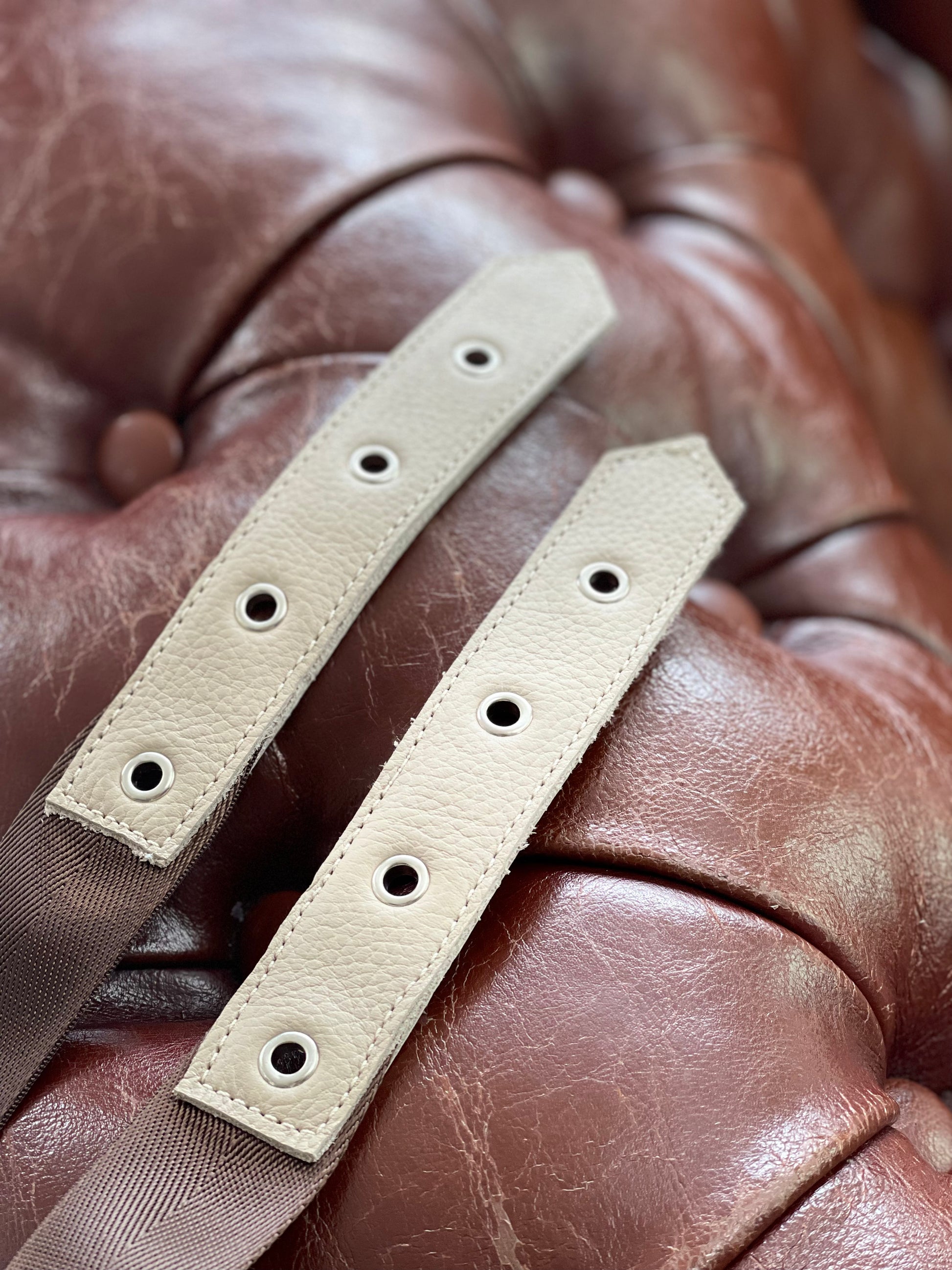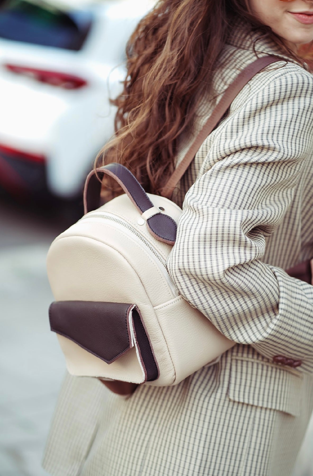 • Farben: Creme (Hauptkörper) & Dunkelbraun (Frontklappe, Trägerdetails)