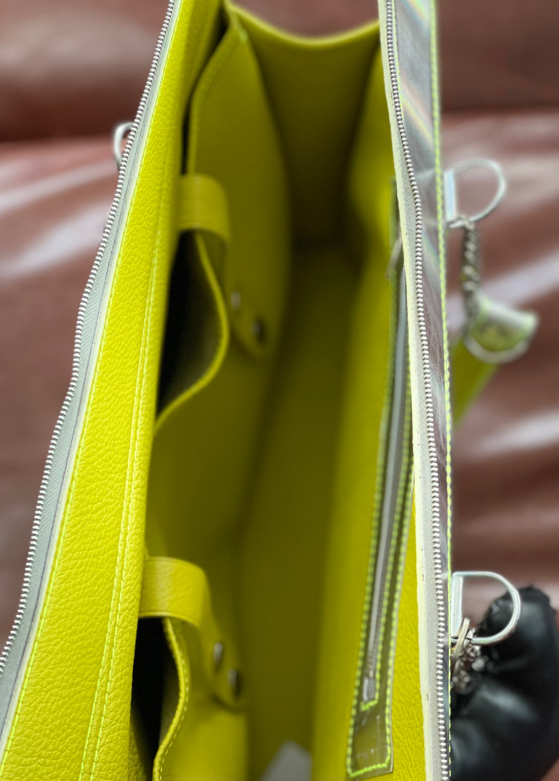 Die MIRRA ist mehr als nur eine Tasche - sie ist ein glänzendes Statement mit Charakter. Außen präsentiert sie sich in schimmerndem Regenbogen-Silberleder, das je nach Licht in verschiedenen Farben reflektiert. Innen überrascht sie mit apfelgrünem Leder - frisch, modern und mutig.